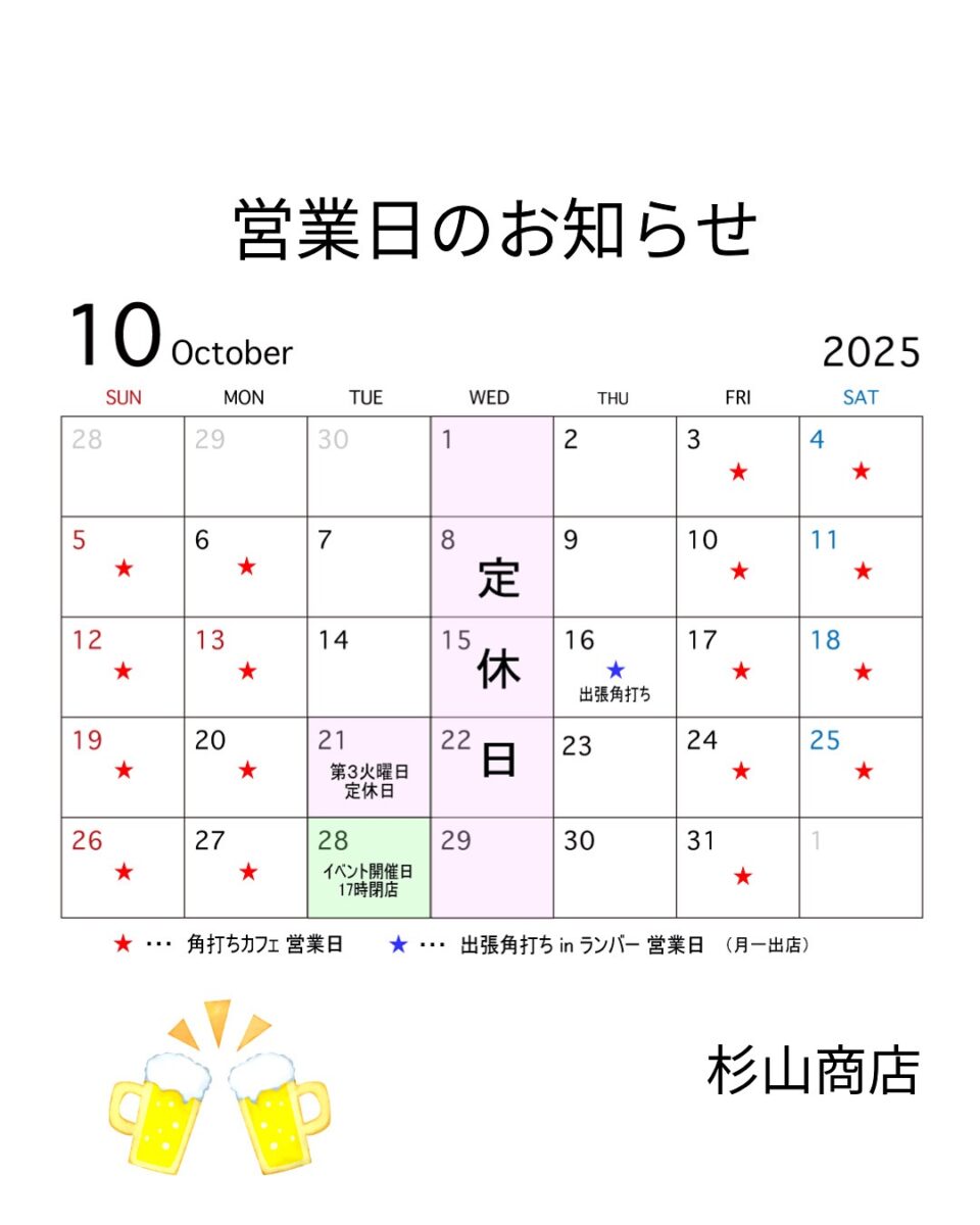 酒屋業務の営業日と合わせて「角打ちカフェ」の営業日は、画像のカレンダーの☆印を見ていただけると幸いです。