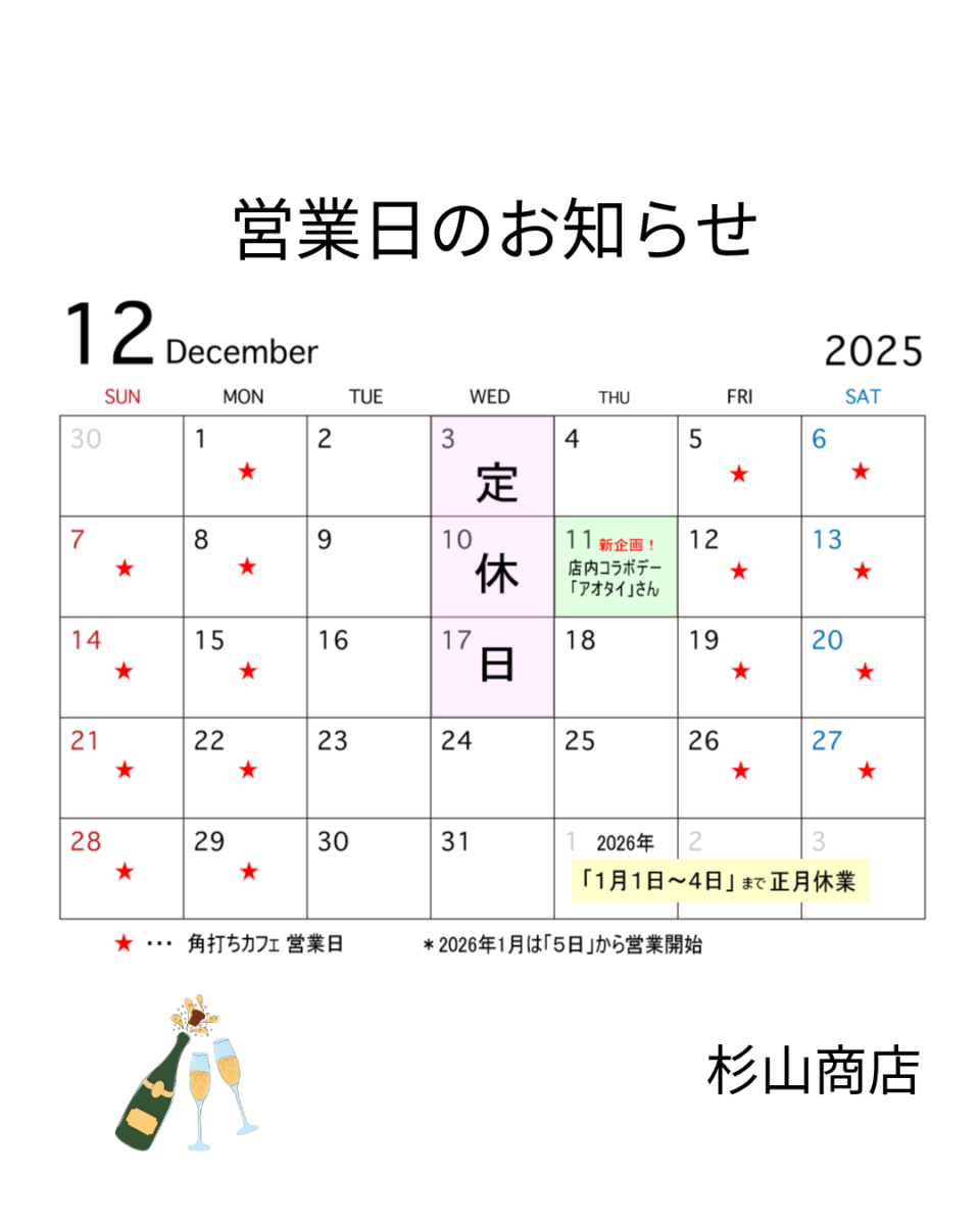 12月の「角打ちカフェ」の営業日は、画像のカレンダーの星印を見ていただけると幸いです。