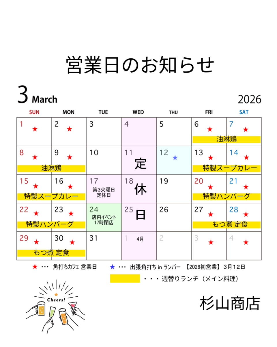 酒屋業務の営業日と合わせて「角打ちカフェ」の営業日は、画像のカレンダーの☆印を見ていただけると幸いです。