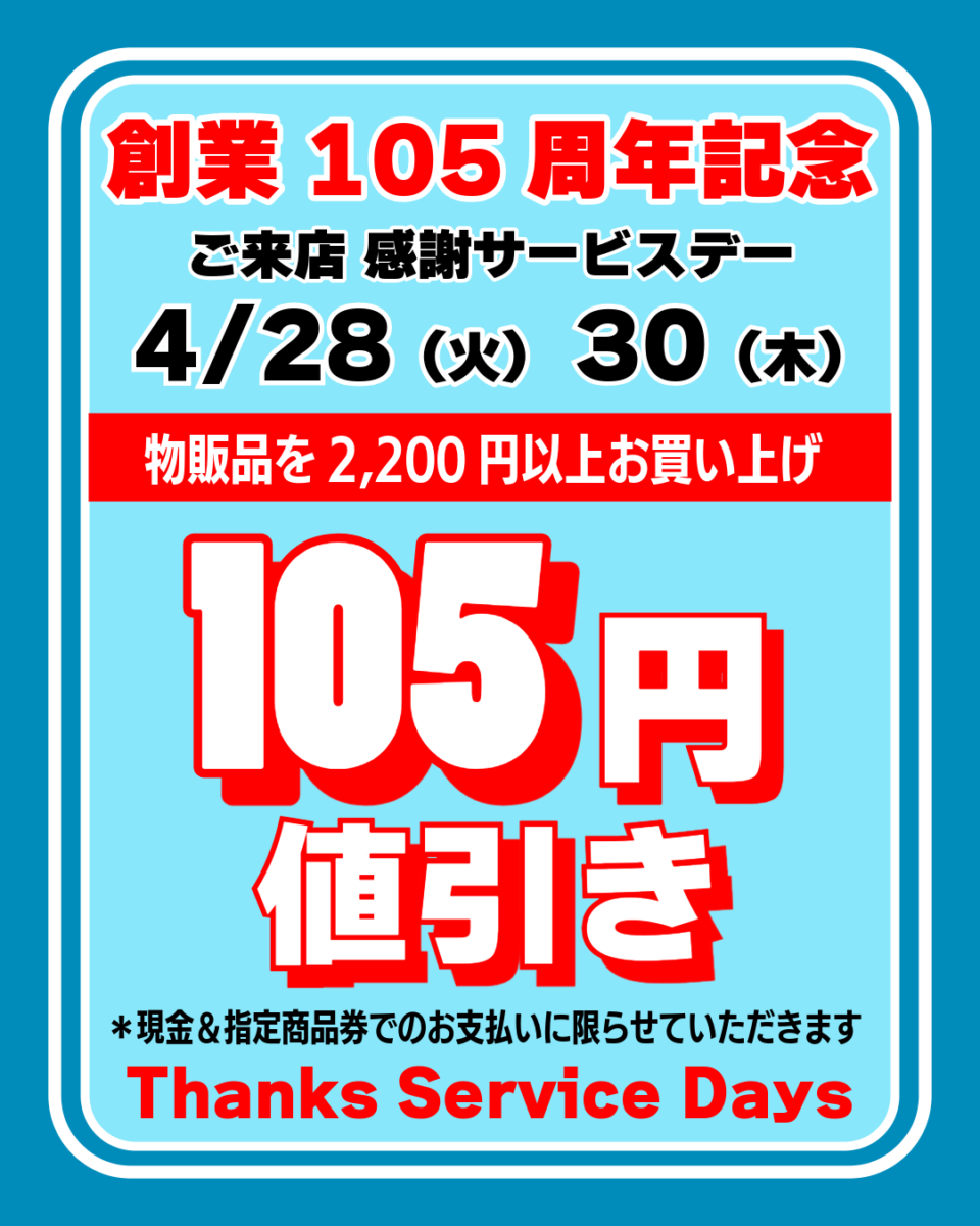 4/28(火)、4/30(木)の二日間ではありますが、感謝還元セール「105円お値引き」サービスを行います!