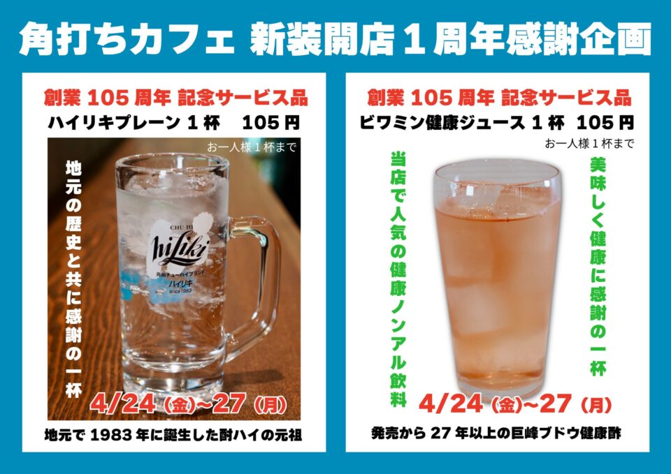 4/24(金)~27(月)まで、創業105周年にちなんで、「105円(税込)」ドリンクサービスを実施します!